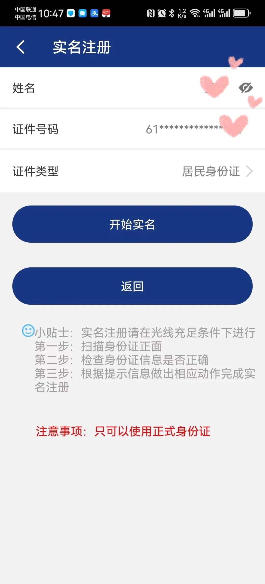 第四步:完成实名注册后,进入扫描身份证页面。本养注:不能戴帽子头饰和眼镜。老保填写完毕后点击“开始实名”,证开